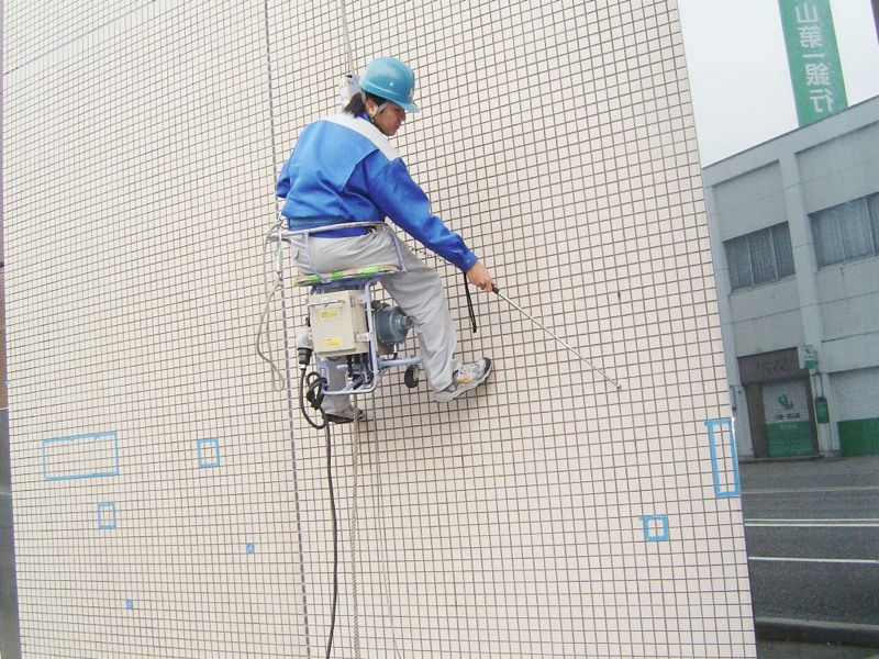 - テストハンマーなどを用いて外壁などの表面(タイル・モルタル・コンクリー ト・その他の仕上げ材)をたたき、浮き範囲などを異常音により判定する「打診 診断」を行います。外壁のうち、特に剥落の危険の大きいと思われる部分について部分的に打診を実 施する「部分打診法」や、ゴンドラや足場を使用して、外壁の全面を打診する 「全面打診法」がございます。