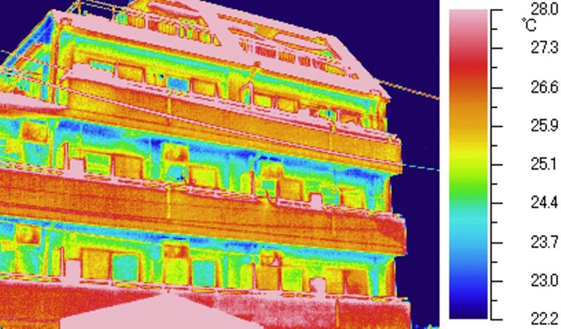 - 赤外線サーモグラフィー(赤外線熱画像装置)を使用し、対象構造物から出てい る赤外線放射エネルギーによって劣化程度を見極める調査です。外壁の浮き・剥 離部は、内部に空気層ができます。 空気層のある劣化部と健全部の熱の伝わり方が異なることを利用し、劣化異常部 を非破壊にて発見できます。