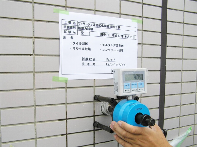 - 引張試験機(日本建築仕上学会認定・テクノテスターR-ND)を使用し、外壁タイ ル・塗膜・外壁補修用各種材料・外壁補修用アンカーピンなどの付着力や接着力 強度など様々な引張荷重を試験し、確認いたします。