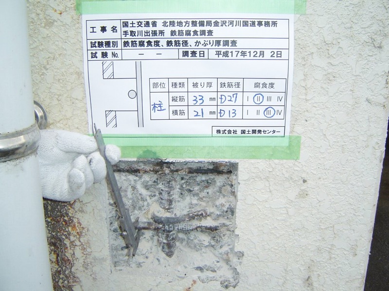- コンクリート駆体に鉄筋が存在する箇所をRCレーダー(鉄筋探知機等)にて、はつり位置を決めて砕り取り、内部鉄筋を露出させて、鉄筋表面の腐食度を目視観 察によってグレート区分判定します。 その際、鉄筋のかぶり厚さ・直径・仕上げの種類及び構成と厚さも計測し記録します。