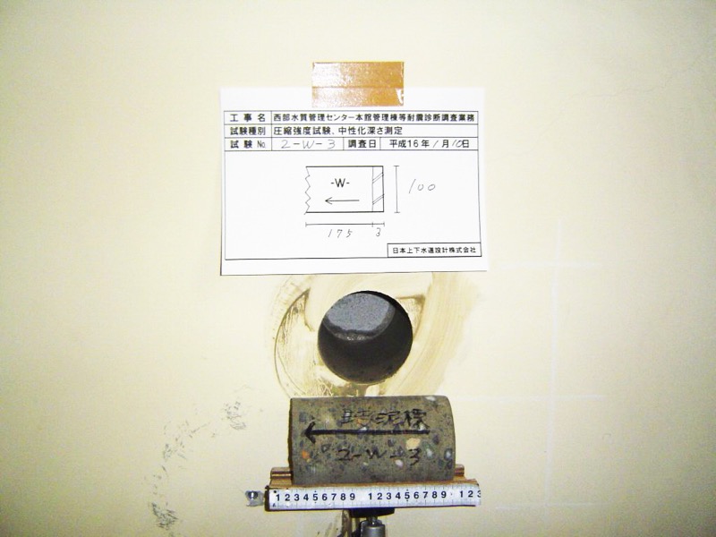 - 既存建物の一部からコンクリートコアサンプルを摂取し、圧縮強度などの試験を します。当初の設計コンクリート圧縮強度と比較し、コンクリートの強さを測定 (公的第3者機関へ依頼)したり、中性化速度係数を求めます。また、シュミットハンマーによるコンクリート圧縮強度推定試験も行います。