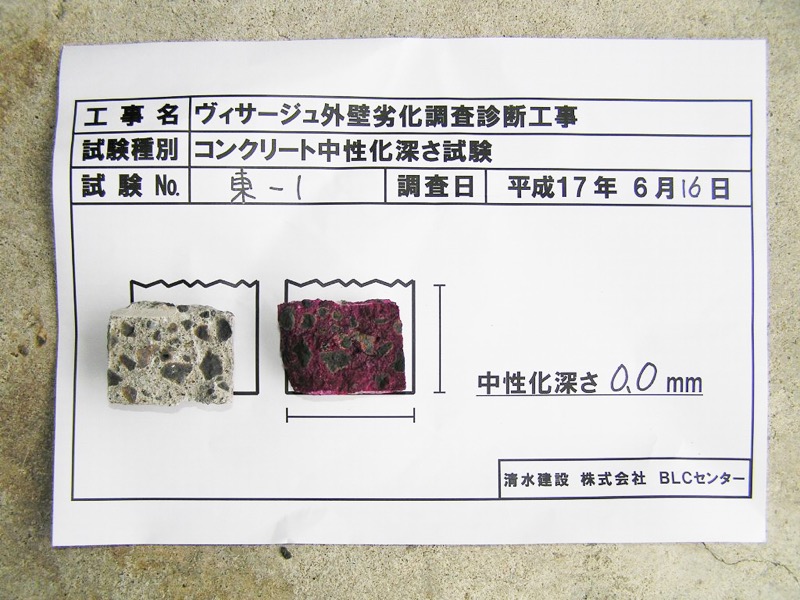 - コンクリートは本来アルカリ性ですが、年月が経つうちに雨水や排気ガスの影響で、表面から少しずつ炭酸化していくことを中性化といいます。鉄筋のまわりにあるコンクリートが中性化すると、鉄筋が錆びやすくなります。採取したコンクリートコアサンプルより、フェノールフタレイン1%アルコール溶液を噴霧し、無色の部分を中性化域、赤く着色した部分を未中性化域と判定します。